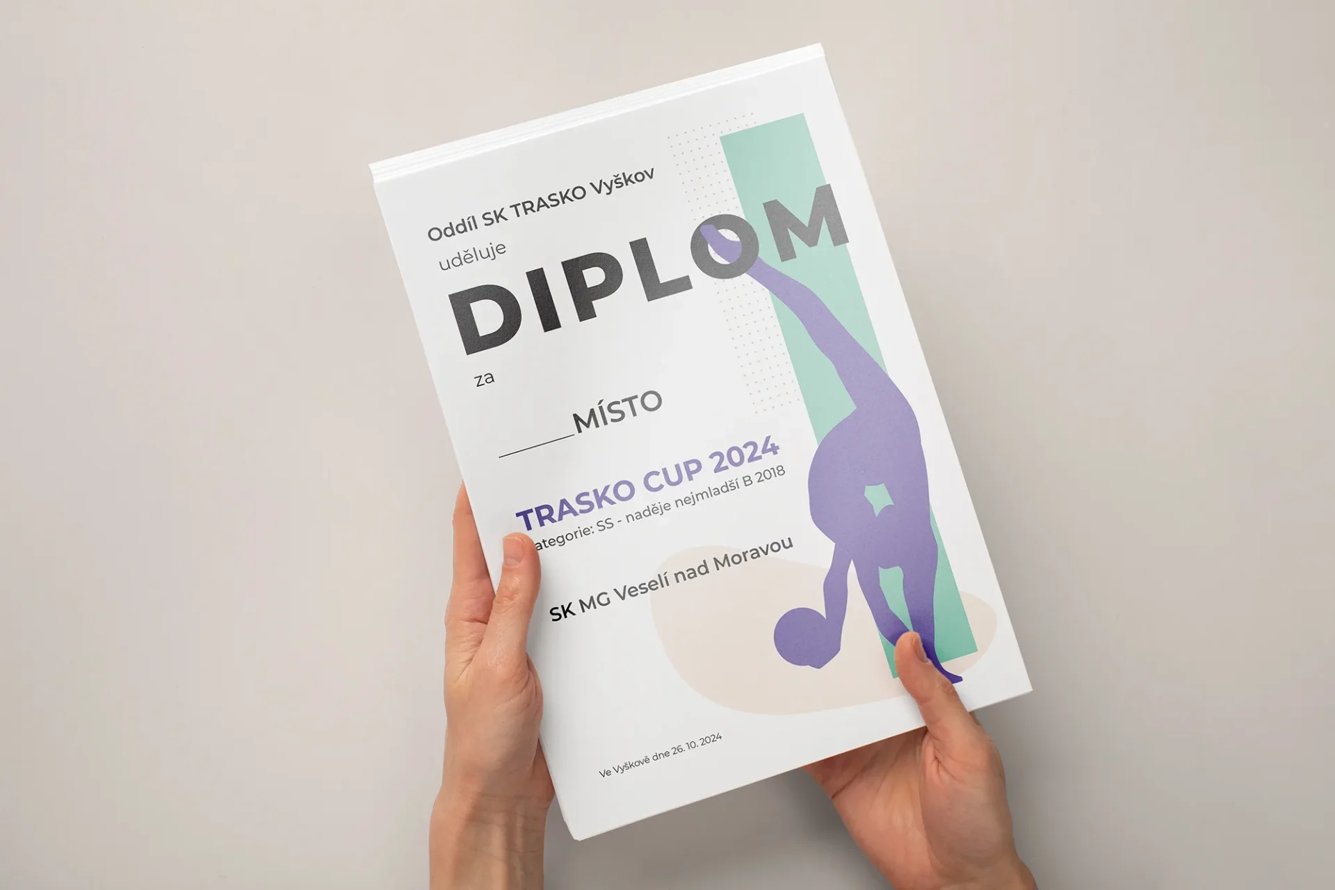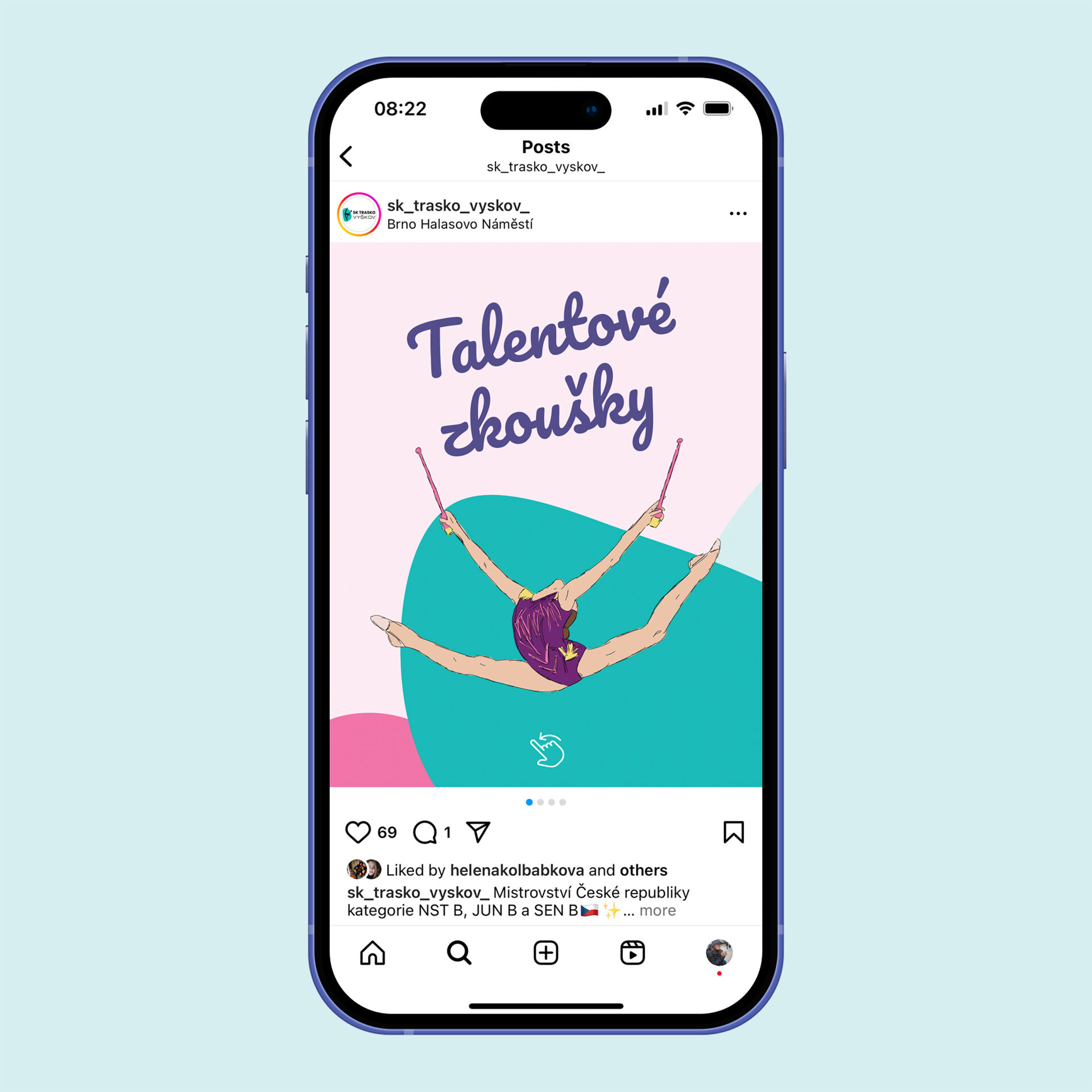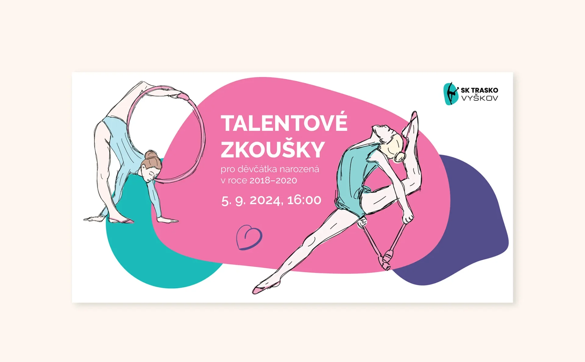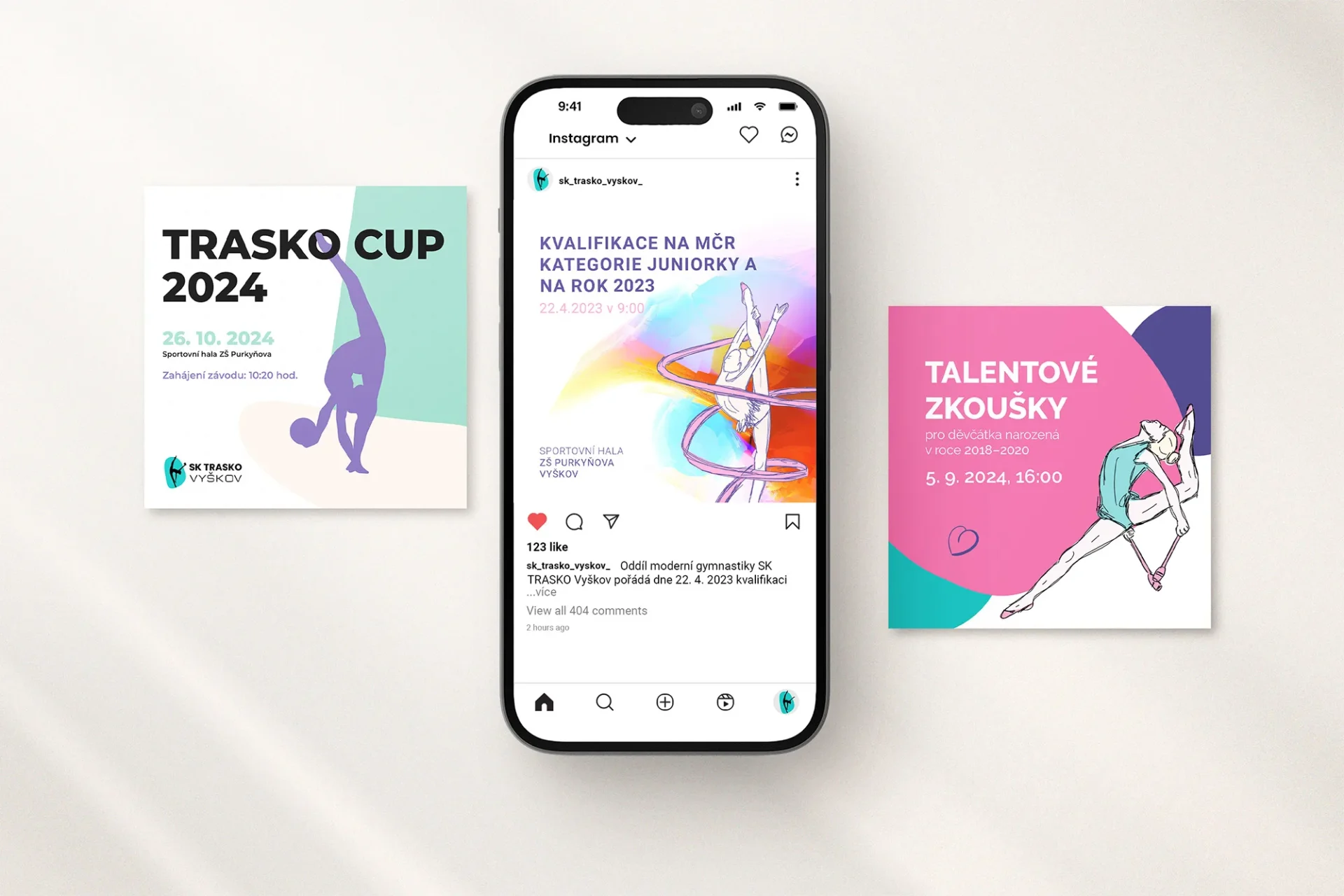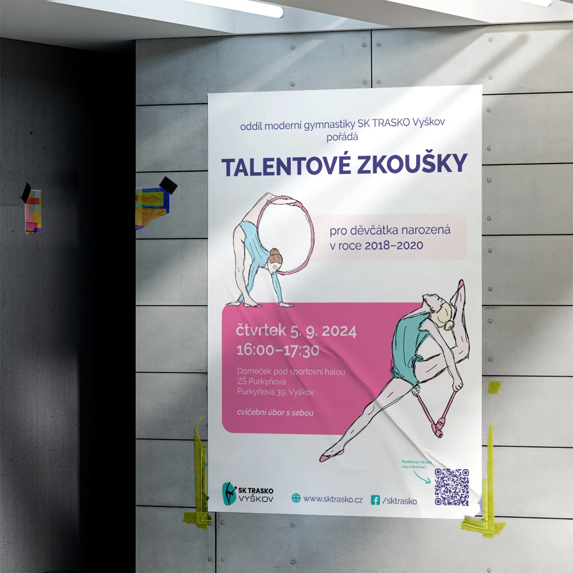 Návrhy plakátů, letáků, diplomů, příspěvků na sociální sítě a dalších tiskovin pro oddíl moderní gymnastiky SK TRASKO Vyškov v jednotném vizuálním stylu, přizpůsobeném potřebám závodů i propagaci napříč různými platformami.